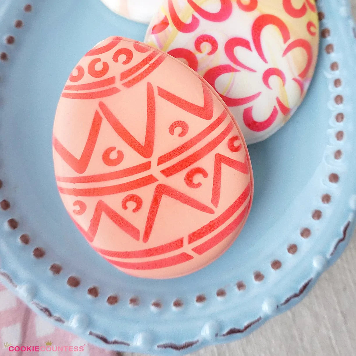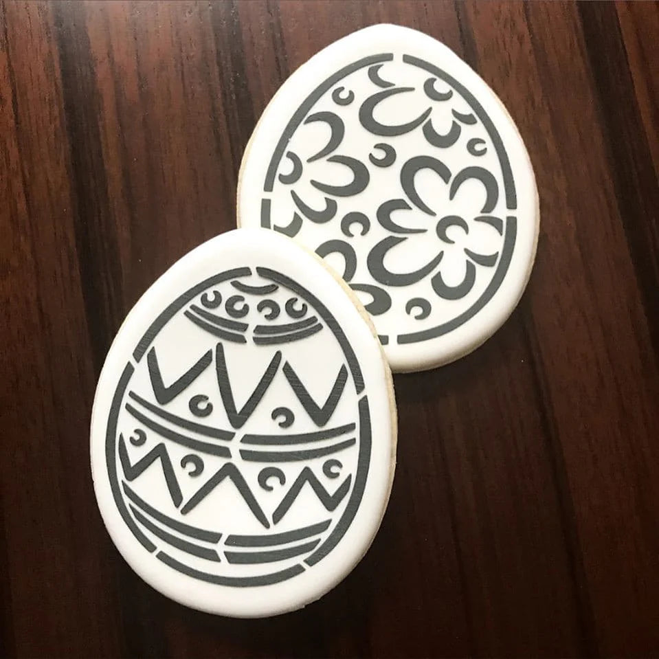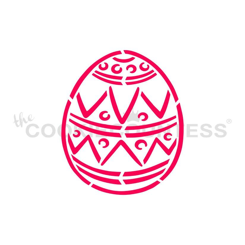 Easter Egg PYO 1 stencil. Design size is 2.67" x 3.25" Use as a Paint your Own stencil, or as it's own design! Overall stencil size is approximately 5.5" x 5.5". PINK sections in image are the open sections. Stencils are 5mil Food Grade plastic, washable and reusable.